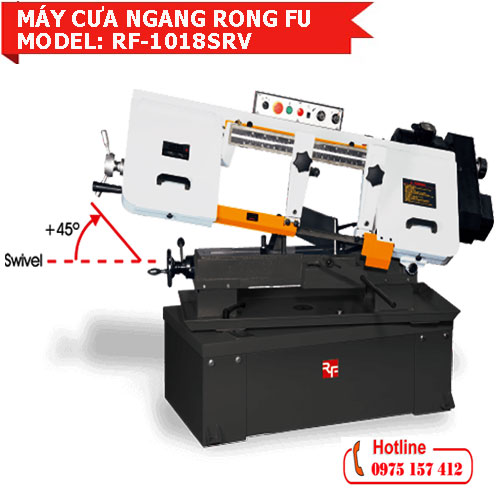 Máy cưa vòng ngang RF-1018SRV có tốc độ điều chỉnh vô cấp 18~78mpm. Khung cưa của nó cho phép xoay được +45 độ, nên khả năng cắt góc lớn hơn các loại máy cưa ngang 250mm khác. Máy cưa kim loại RF-1018SRV được nâng cấp từ máy cưa phôi thép RF-1018SV. Nó chuyên dùng để cắt thép ống, sắt hộp, sắt la hoặc thép V… độ chính xác cao và nhanh chóng. Do đó, máy cưa sắt RF-1018SRV được dùng nhiều trong cơ khí, công nghiệp và trường học.