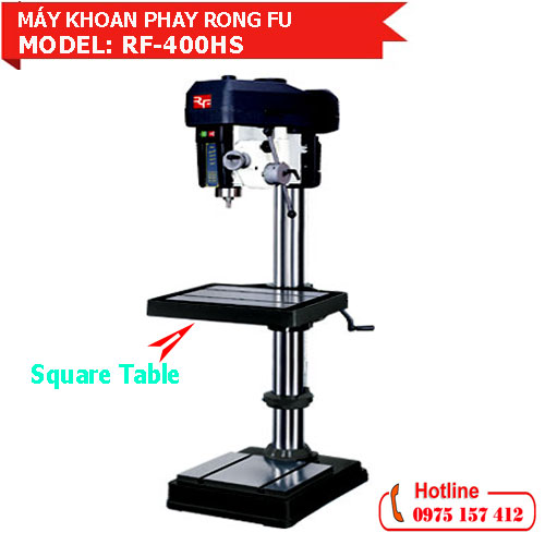 Máy khoan bàn Rong Fu RF-400HS được sản xuất tại Đài Loan, chuyên dùng để khoan hoặc ta rô nhỏ. Khoan bàn RF-400HS còn được gọi là máy khoan đứng 32mm công suất 1.5HP. Nó có đầy đủ chức năng phay mặt, phay ngón như máy khoan phay RF-400HC. Nhưng do, bàn làm việc của RF-400HS là bàn vuông nên không thể tịnh tiến phôi để thuận lợi gia công phay. Khách hàng muốn dùng máy khoan bàn RF-400HS để phay thì phải mua thêm bàn phay mini.