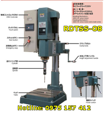 Máy khoan và taro RDTSS-08 hiệu TAC được thiết kế đa năng, nhập khẩu từ Japan. Đây là máy khoan bàn 5mm kèm taro M1~M6 tốc độ cao. Nó chuyên dùng để khoan lỗ, taro tạo ren các đường kính nhỏ, chính xác trên sắt thép, nhôm gang. Máy taro kim loại đa năng RDTSS-08 có khả năng khoan lỗ phi 5mm. Taro các đường kính lỗ M1-M6 với độ chính xác cao, ít gãy mũi taro do sử dụng motor servo.