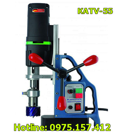 Máy khoan từ Karnasch KATV-55 còn gọi là máy khoan từ có taro tích hợp nhiều chức năng. Nó được sản xuất tại Đức chuyên cho các ứng dụng khoan lỗ nhanh trên thép tấm, thép dầm và bảng mã. Máy khoan từ có taro KATV-55 có khả năng khoan xoắn 3-23mm, khoan khoét từ 12-55mm. Ngoài ra, máy khoan từ châu âu này còn có thể dùng để vát miệng lỗ 10-40mm hoặc taro ren từ M6-M20. Do đó, nó thường được dùng nhiều trong cơ khí, xây dựng kết cấu thép tiền chế.