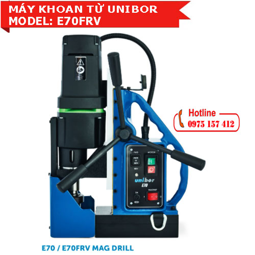 Máy khoan từ Unibor E70FRV còn gọi E70FRV Mag Drill là dòng máy khoan từ đa năng nhập khẩu từ Anh Quốc. Nó có nhiều chức năng như khoan xoắn 3-32mm, khoan cắt 12-70mm, taro M4-M24. Công suất động cơ lớn, hành trình khoan tối đa 8″ cho phép khoét được nhiều tấm thép dày. Máy khoan từ E70FRV được dùng nhiều trong kết cấu thép nhà xưởng: khoét cắt trên thép tấm, bảng mã, cánh dầm.