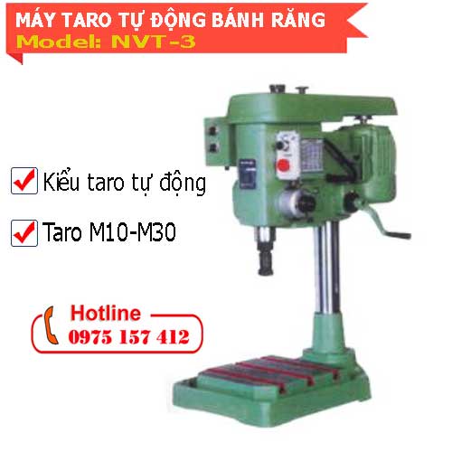 Máy taro tự động NVT-3 hiệu Nambuk nhập khẩu Hàn Quốc còn gọi là máy taro kim loai tự động bánh răng M10-M30. Nó chuyên dùng để taro trên sắt thép, khuôn mẫu cần độ chính xác cao. Đường kính taro nhỏ nhất M10, đường kính taro lớn nhất M30. Mỗi bước ren taro khác nhau, cần thay thế bánh răng phù hợp. Máy taro kim loại NVT-3 được dùng nhiều trong cơ khí, gia công cơ khí.
